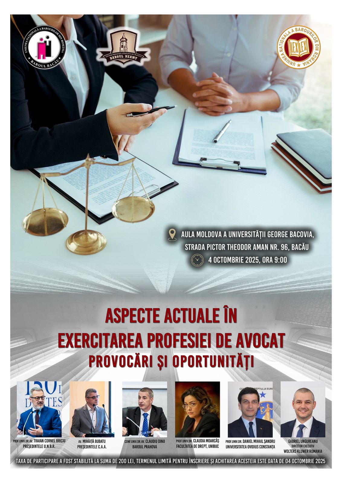 Baroul Bacău, în colaborare cu Baroul Neamț, INPPA și UNBR, organizează în data de 04 octombrie 2025, cu începere de la orele 9.00, în Aula ”Moldova” a Universității George Bacovia din Bacău, str. Pictor Theodor Aman nr. 96, seminarul anual de pregătire profesională continuă a avocaților, cu tema: ”ASPECTE ACTUALE ÎN EXERCITAREA PROFESIEI DE AVOCAT - PROVOCĂRI ȘI OPORTUNITĂȚI” Taxa de participare este de 200 lei.